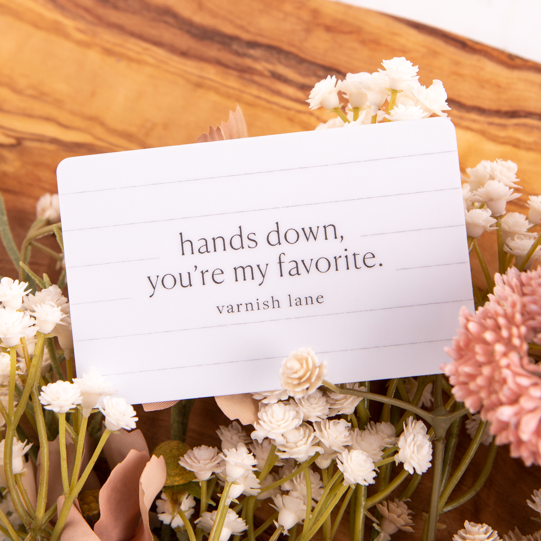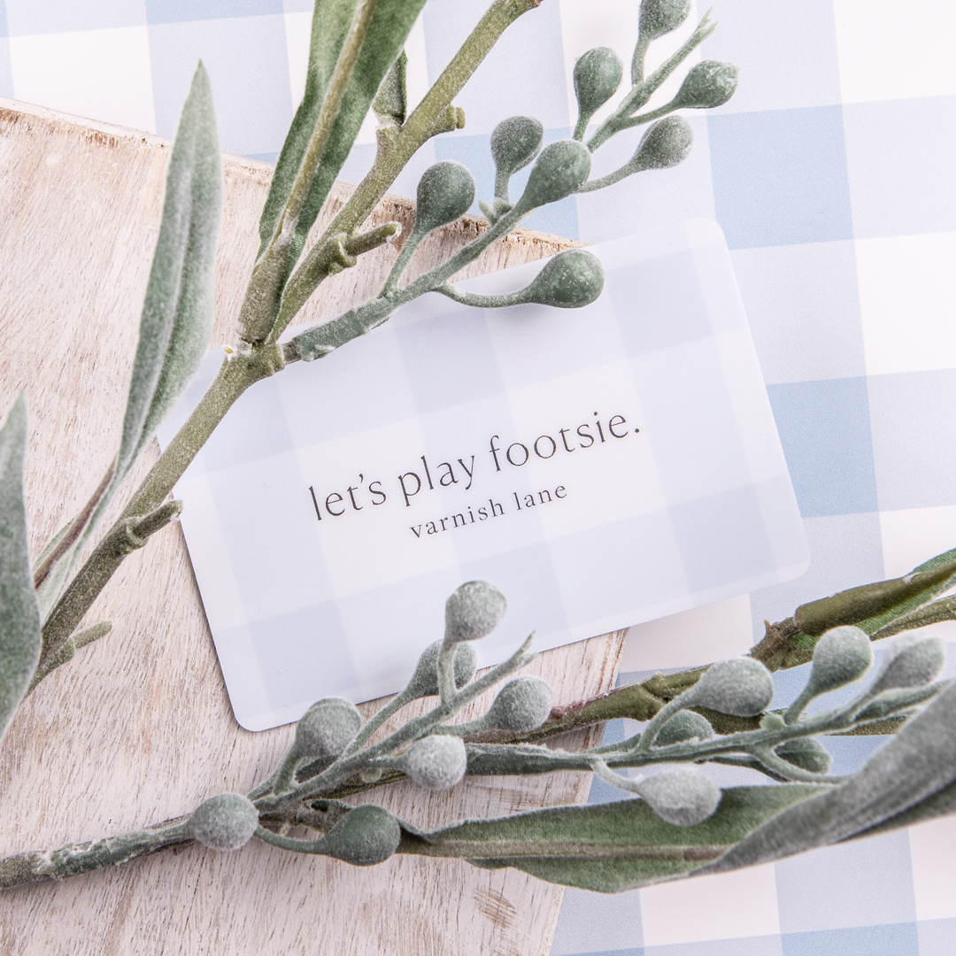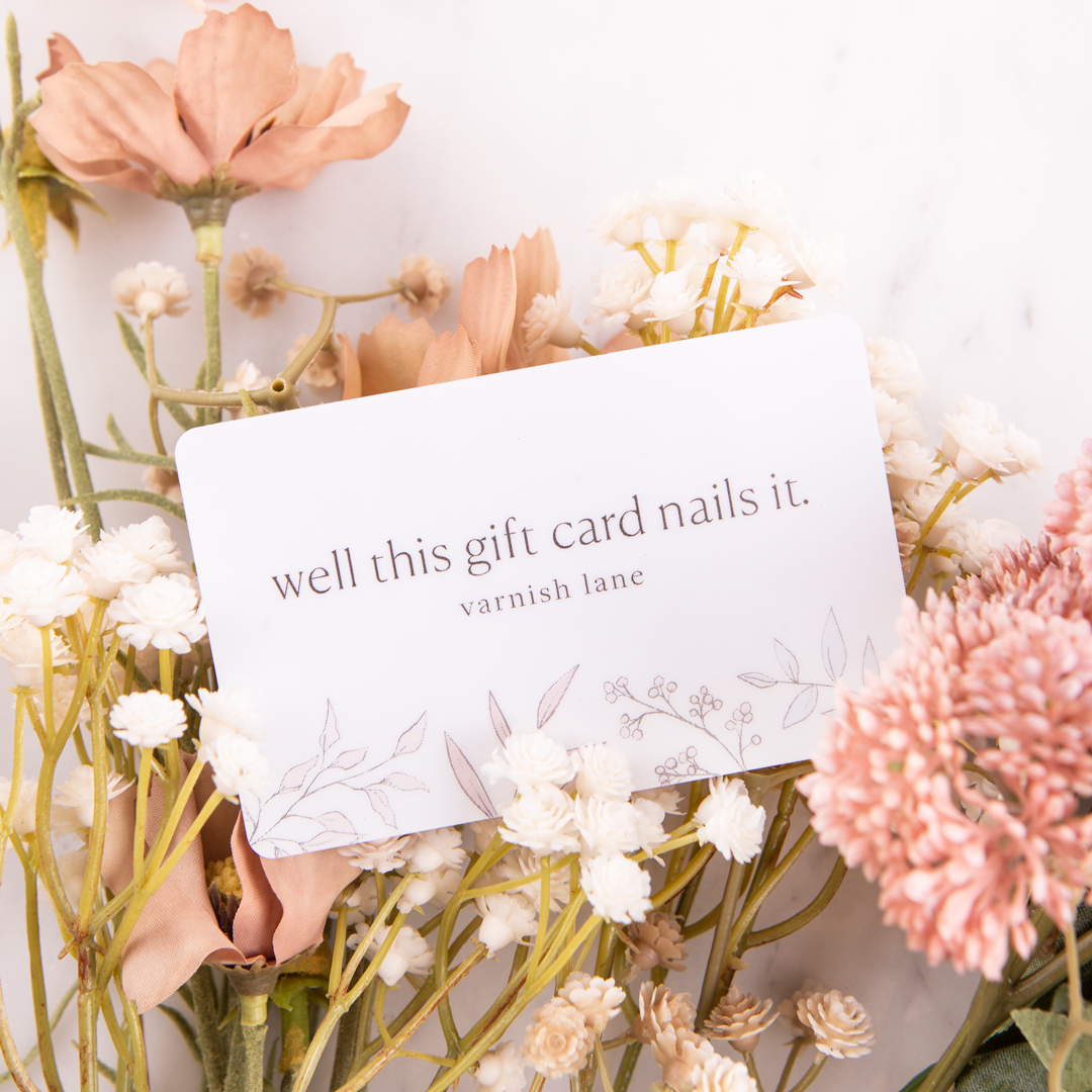 Looking for the perfect gift for birthdays, holidays, or just because? A Varnish Lane gift card is a thoughtful and luxurious way to treat someone to a relaxing, waterless manicure or pedicure at any of our locations. This physical gift card will be mailed directly to the recipient and can be redeemed at any of our Varnish Lane locations.